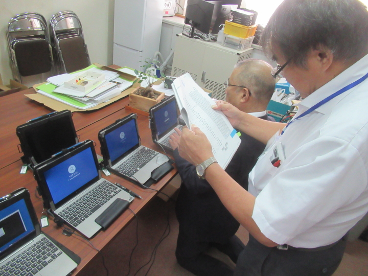 2名のスタッフは校長先生のアドバイスを受けながら、点検・修理のノウハウを伝授してもらい、早速、5台のタブレットを改善することができました。