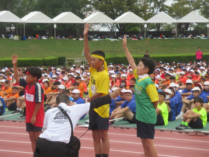 子どもたちはルールを守り、練習してきた成果を元気一杯発揮していました。保護者も多数参加され、盛んに大きな声で応援をしていました。運動会は最後の学校対抗400mリレーで最高潮に盛り上がり、無事に終了することができました。